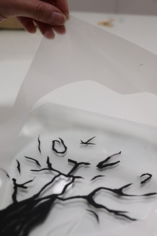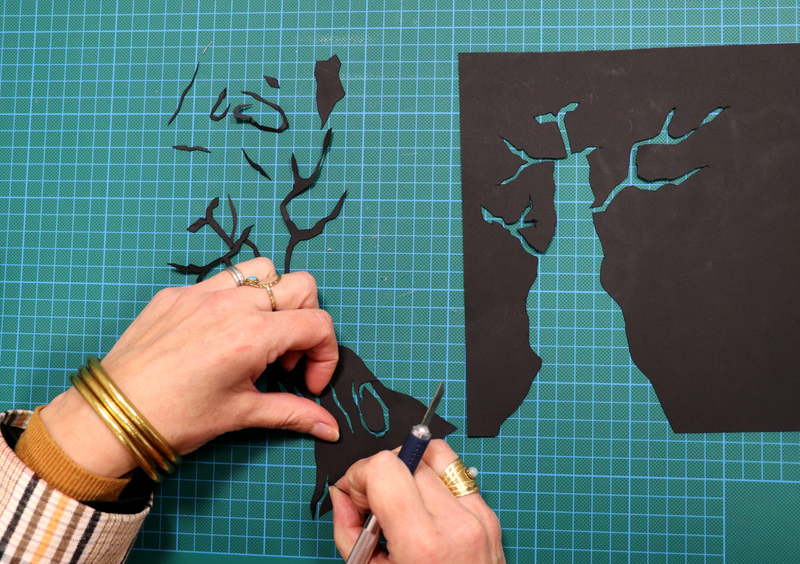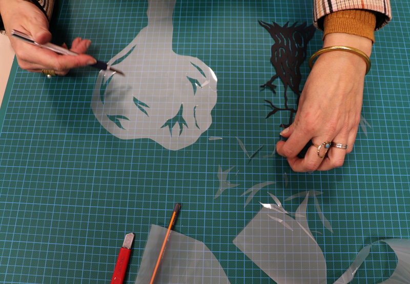 Les supports papiers peuvent être découpés. Les découpages posés sur le support préalablement enduit vont masquer les zones et révéler une surface blanche après nettoyage (négatif).