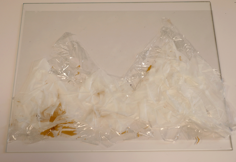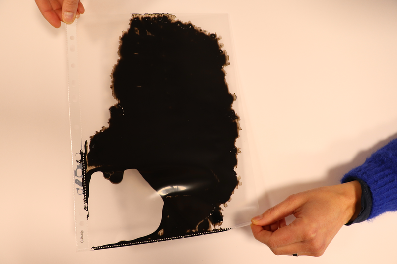 Coulures d'encre de chine réalisées à l'aide d'une pochette plastique transparente.
