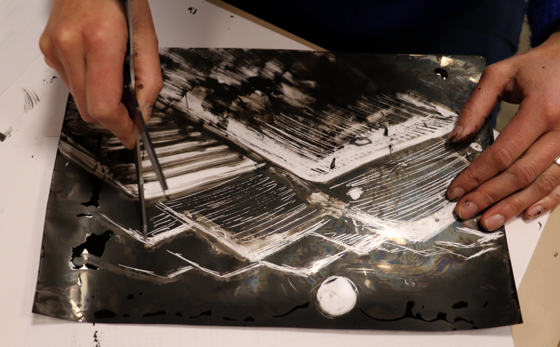 Les cartes à gratter sont réalisées à partir d'encre de chine étalée et séchée sur pochettes transparentes. Cette surface peut ensuite être essuyée, grattée, frottée...