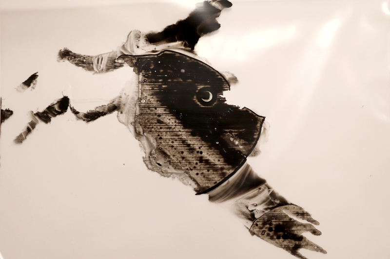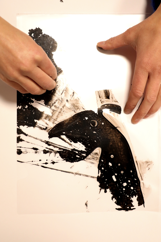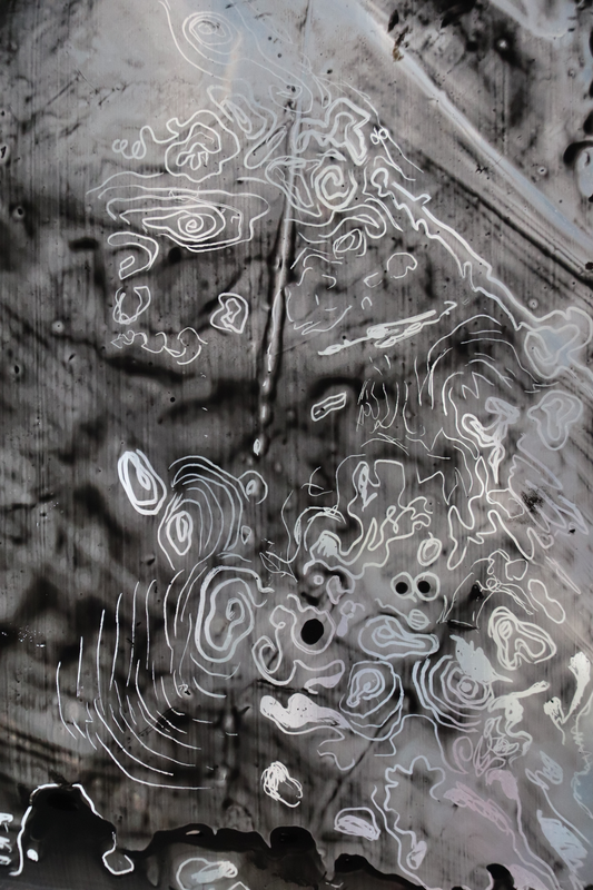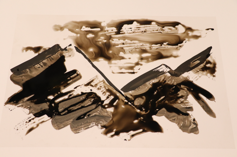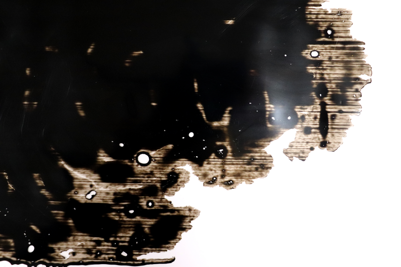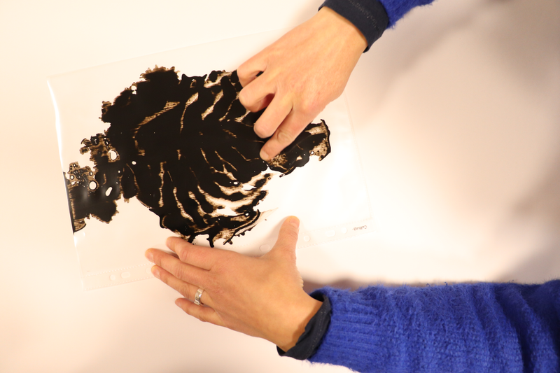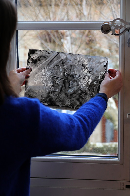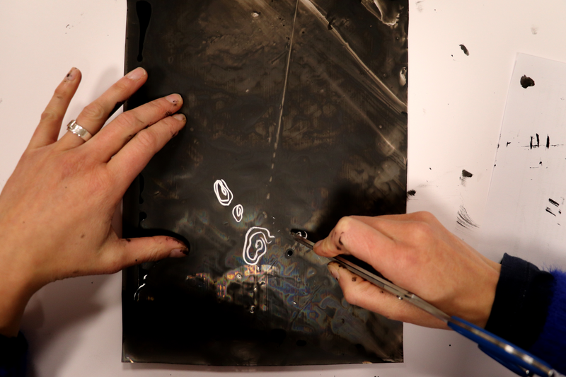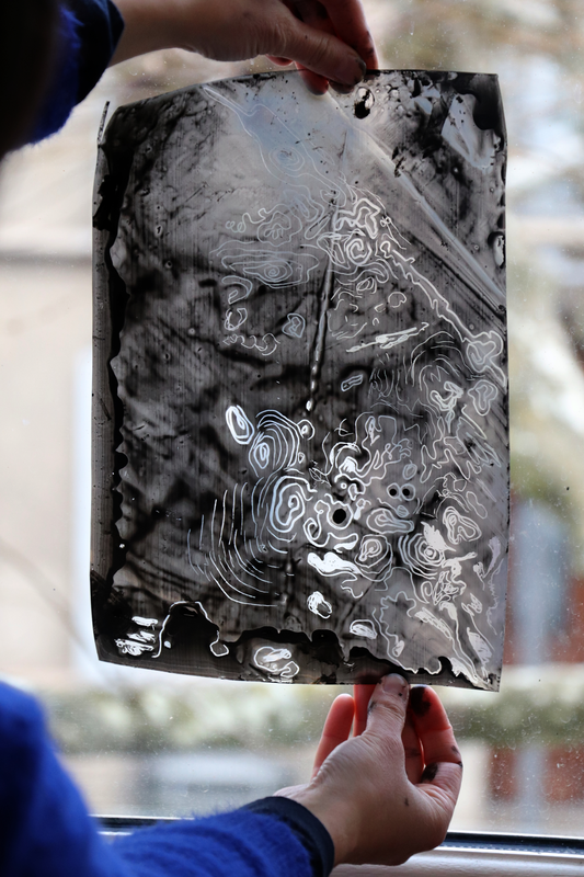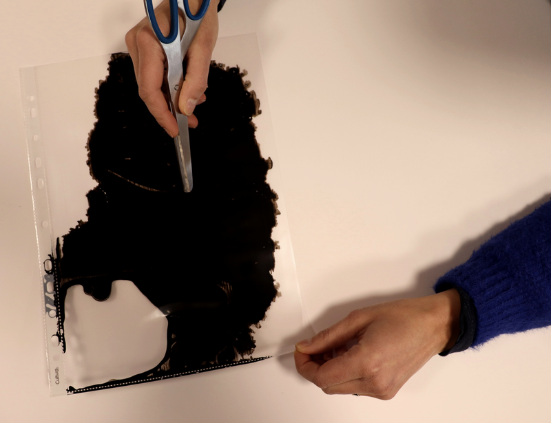 Le transparent a été enduit d'encre noire. Après séchage, l'on peut la gratter avec des ciseaux pour faire apparaître des formes. Les parties enlevées seront pleines à l'impression (en négatif).