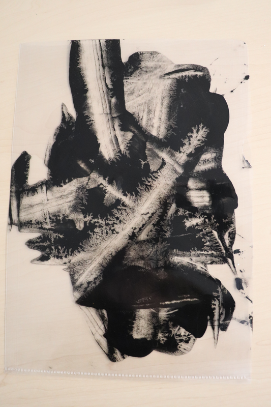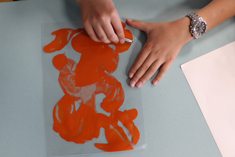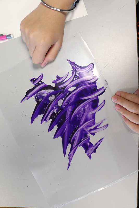 Les élèves se plaisent à faire évoluer leur peinture écrasée sous les transparents plastiques.