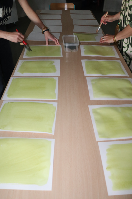 Au préalable, nous avons enduit les supports et nous les avons laissés sécher 1 heure dans la réserve sur des étagères dans la pénombre. Cette étape indispensable peut être envisageable et aisée (toujours 1 heure de séchage minimum) :